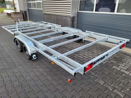 Remorque de type châssis tiny house. Cette remorque est conçue pour recevoir un chalet ou une construction sur sa structure métallique.